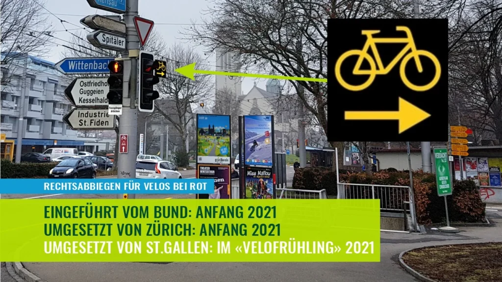 Auch wenn die Montage der Rechtsabbiegetafeln nun doch früher als angekündigt erfolgt ist, so steht allein die Absicht, dies erst im «Velofrühling» vorzunehmen, für die marginalisierende Haltung der Stadt gegenüber dem Veloverkehr. Ein Beispiel unter mehreren Dies ist ein Widerspruch zur Absicht St.Gallen, als Velostadt wahrgenommen werden zu wollen.