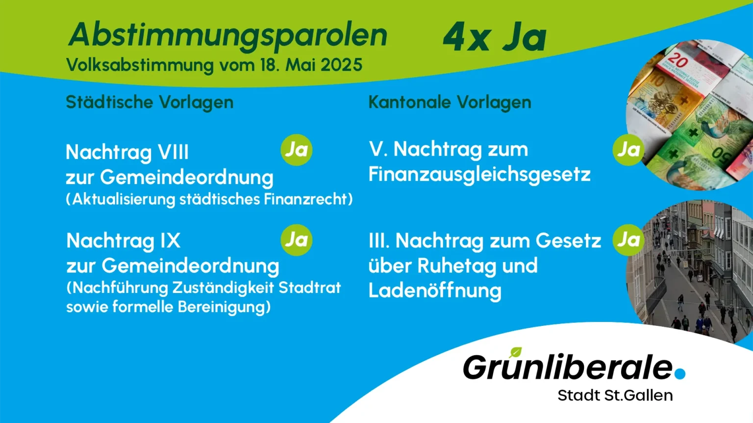 Die Grünliberalen Stadt St.Gallen fassten an ihrer Jahresversammlung die Ja-Parolen zu allen Abstimmungsvorlagen vom 18. Mai 2025.