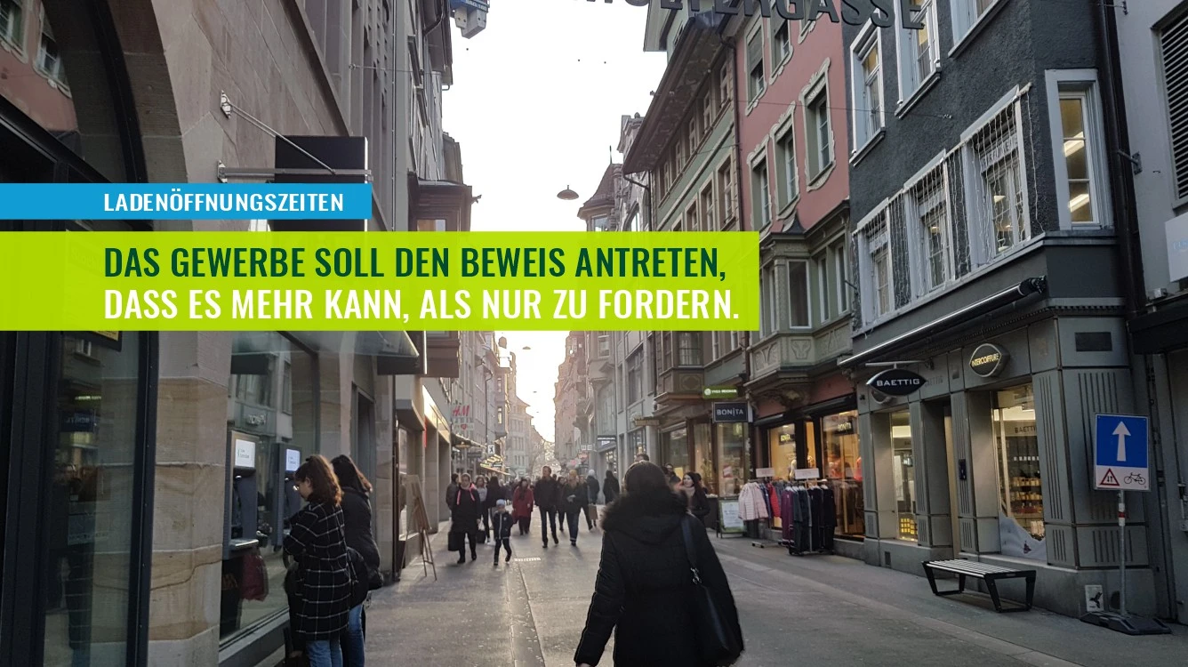 Wir Grünliberalen stehen hinter den vom Stadtrat beschlossenen Liberalisierungsbestrebungen im Bereich der Ladenöffnungszeiten. Von Beginn an unterstützten wir den vom Stadtrat vor- und eingeschlagenen Weg einer Flexibilisierung der Öffnungszeiten in einem bestimmten Perimeter.