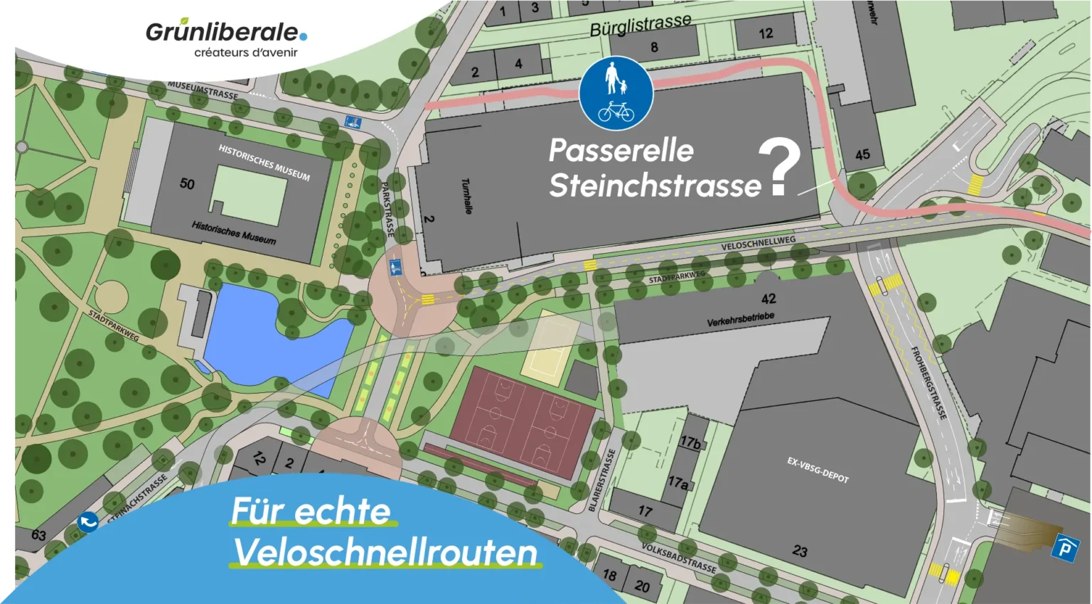 Die Stadt St.Gallen plant eine Passerelle über die Steinachstrasse als Teil der künftigen Velovorzugsroute. Die Grünliberalen stehen grundsätzlich für die Förderung des Veloverkehrs ein, stellen jedoch die konkrete Umsetzung in Frage – insbesondere die geplante Passerelle.