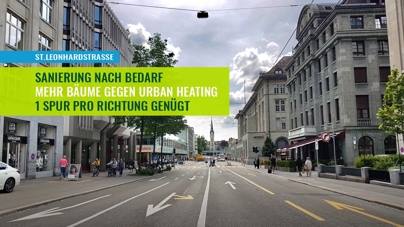 Weniger Fahrspuren und Tempo 30 bedeutet eben auch weniger erzwungene Stopps und es ist womöglich sogar um einiges kostengünstiger. Und seien wir ehrlich, die Fussverkehrübergänge von der Hauptpost zum Neumarkt und vom Kornhausplatz zur Vadianstrasse sind alles andere als attraktiv und Vorzeigeobjekte für die Neuankömmlinge am Hauptbahnhof.